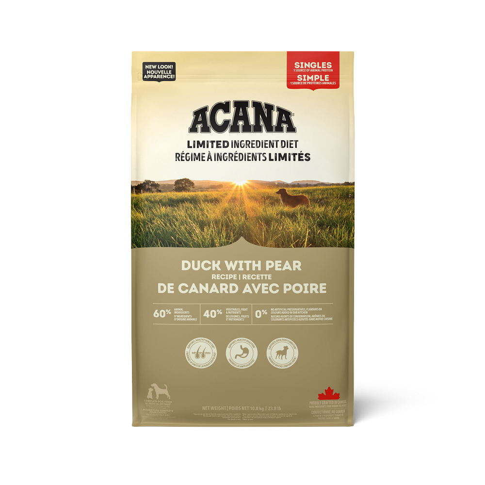 In premium ACANA™ recipes, every ingredient matters. That’s why our ACANA Singles Limited Ingredient Diet Recipes are thoughtfully crafted with protein from a single animal source, making them perfect for picky pups or dogs with food sensitivities! Our Duck with Pear Recipe includes 60% protein-rich duck ingredients balanced with 40% vegetables, fruit and nutrients like nutritious pears, and no grain ingredients. It also includes no artificial preservatives, flavours or colours added in our kitchen. This recipe helps support 3 key health benefits for your dog, including healthy skin & coat, healthy digestion and ideal body condition. It helps your dog feel so good on the inside, you’ll see it on the outside!