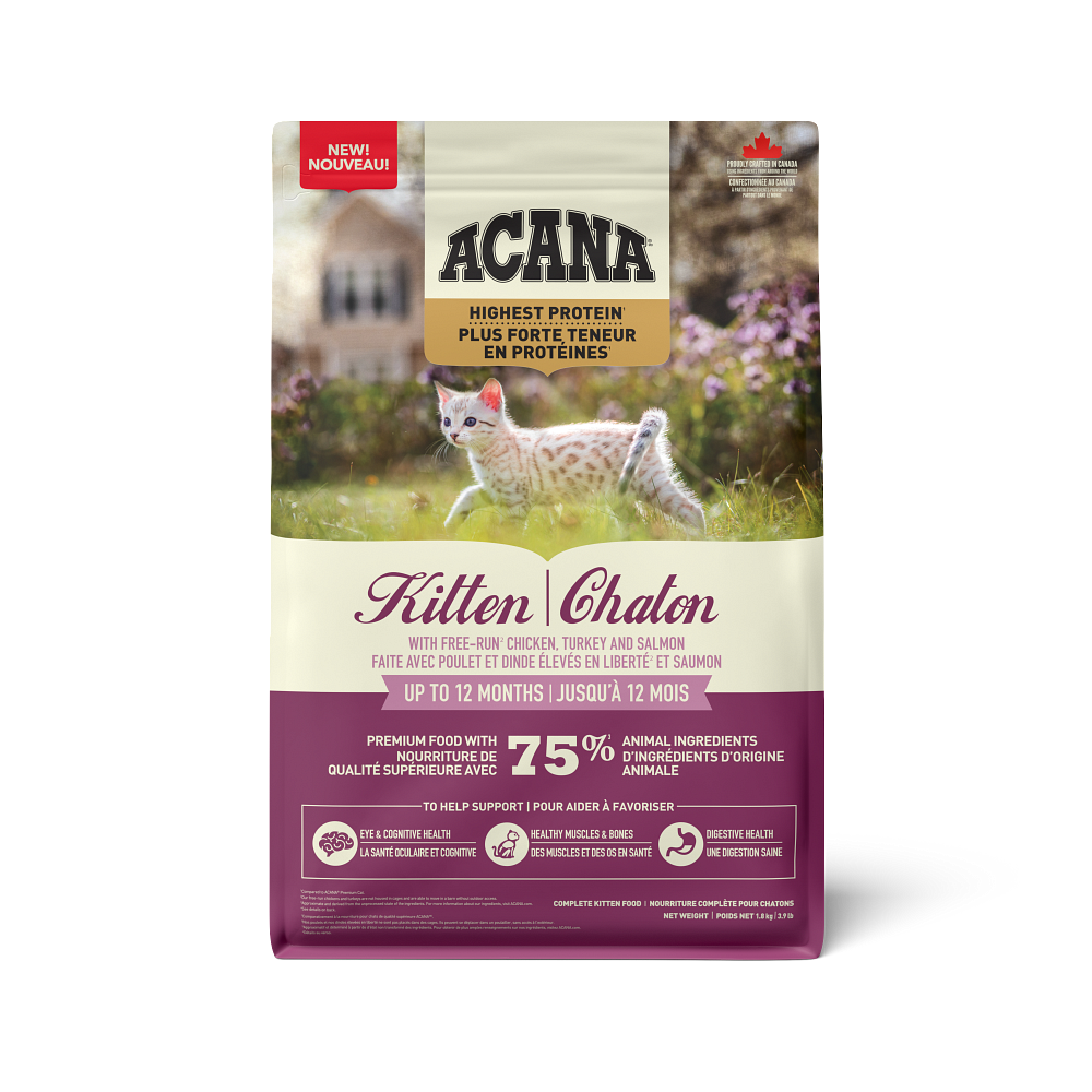 Nurture your growing kitten with more animal protein in ACANA™ Highest Protein Kitten recipe. Perfect for kittens up to 12 months old, this premium recipe is rich with 75% animal ingredients including free-run chicken, turkey, and salmon to satisfy and nourish your young feline. Our nutritious ingredients also help support the healthy development of your kitten, including healthy heart & eyes and digestive health. See your kitten grow up healthy and strong with protein-rich recipe crafted specially for their needs.