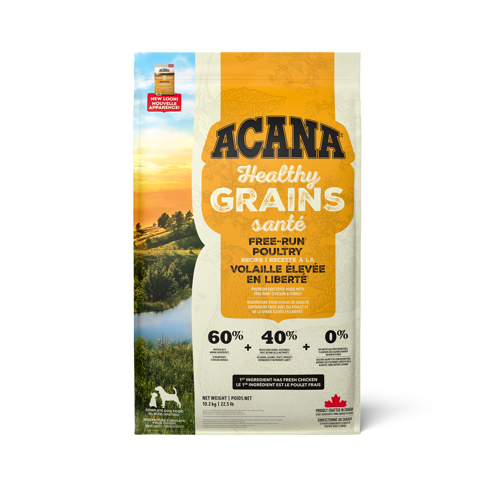 Get obsessed with protein-rich animal ingredients and fiber-rich wholesome grains in ACANA™ Healthy Grains! Our ACANA™ Healthy Grains Free-Run1 Poultry Recipe is specially crafted with fresh or raw free-run chicken and turkey. It’s also balanced with healthy grains in the form of oats, sorghum and millet. These grains are high in fiber and gluten-free, offering added nutrition that helps support a healthy digestive environment. Our Free-Run Poultry Recipe is crafted with 60% animal ingredients balanced with 40% wholesome grains, vegetables, fruit, botanicals and nutrients and helps support 4 key health benefits. This results in a protein-rich, nutritious and delicious food to help them live a full, happy life.