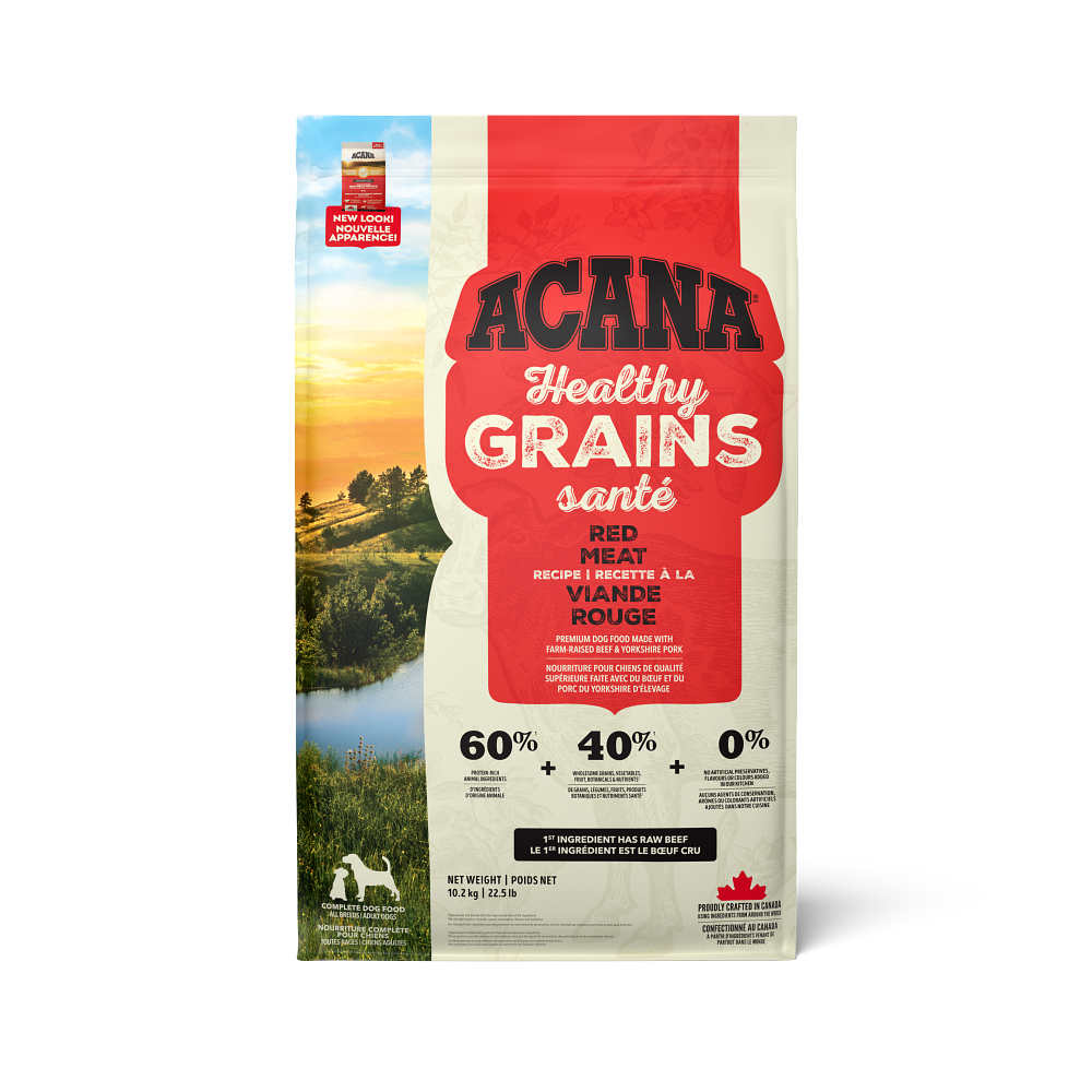 Get obsessed with protein-rich animal ingredients and fiber-rich wholesome grains in ACANA™ Healthy Grains! Our ACANA™ Healthy Grains Red Meat Recipe is specially crafted with fresh or raw farm-raised beef and savoury pork. It’s also balanced with healthy grains in the form of oats, sorghum and millet. These grains are high in fiber and gluten-free, offering added nutrition that helps support a healthy digestive environment. Our Red Meat Recipe is crafted with 60% animal ingredients balanced with 40% wholesome grains, vegetables, fruit, botanicals and nutrients and helps support 4 key health benefits. This results in a protein-rich, nutritious and delicious food to help them live a full, happy life.