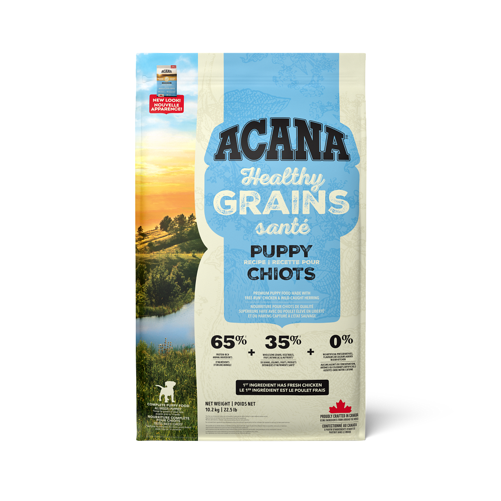Get obsessed with protein-rich animal ingredients and fiber-rich wholesome grains in ACANA™ Healthy Grains! Our ACANA Healthy Grains Puppy Recipe is specially crafted to support the development of growing puppies with fresh or raw free-run chicken and wild-caught herring. It’s also balanced with healthy grains in the form of oats, sorghum and millet. These grains are high in fiber and gluten-free, offering added nutrition that helps support a healthy digestive environment. Plus, our Wholesome Grains Puppy Recipe helps support key health benefits for your puppy including Brain Development and Muscle and Bone Development. This results in a protein-rich, nutritious and delicious food to help them live a full, happy life.