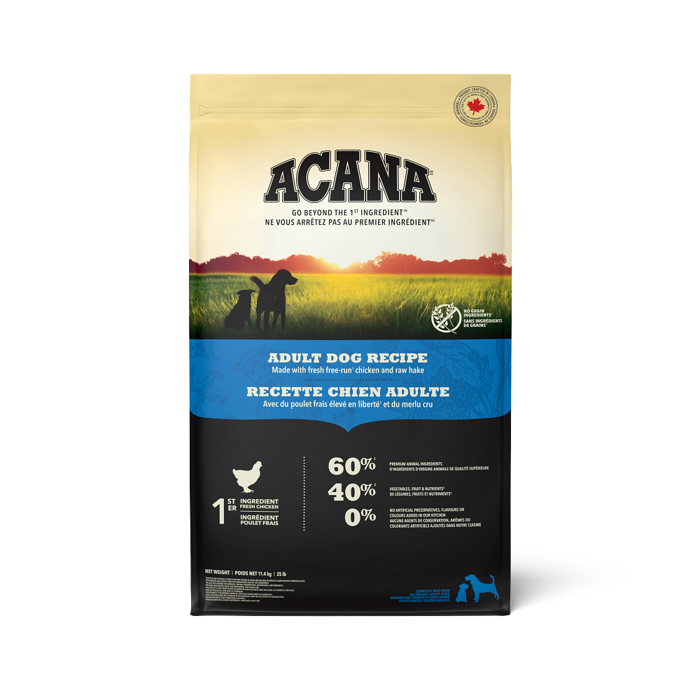 When it comes to ACANA™ food for dogs, we’re obsessed with every ingredient that goes into our premium recipes made right here in Canada. That’s why our Adult Dog Recipe is thoughtfully crafted with ingredients that help meet the needs of all medium breed adult dogs. Made with 60% quality animal ingredients like fresh free-run1 chicken and raw hake balanced with 40% fruit and vegetables like fresh whole pumpkin, greens, apples and pears, this recipe provides the nutrition and animal protein your adult dog needs to live their best life. These wholesome ingredients are provided by suppliers we know and trust, and our vets and pet nutrition experts carefully craft each recipe with the goal of making your pet feel so good inside, you’ll see it on the outside.