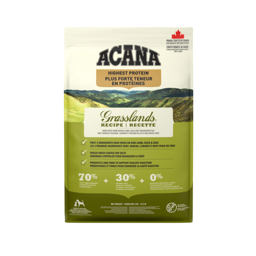 When it comes to ACANA™ recipes, we’re obsessed with choosing ingredients that are nutritious, delicious and protein-rich. Our Highest Protein Dog Food is perfect for satisfying your dog with even more of the animal protein they crave. Our Grasslands recipe is crafted with 70% quality animal ingredients like farm-raised lamb, duck, eggs, and freshwater lake fish balanced with 30% fruit and vegetables to help nurture your dog with flavour and animal protein. It also includes prebiotics and fibre to help support your dog’s digestive health. And with no artificial colours, flavours or preservatives added in our kitchen, it’s a recipe you and your dog will both love. Nurture your dog with a protein-rich, nutritious, and delicious dog food to help them live a healthy, happy life.