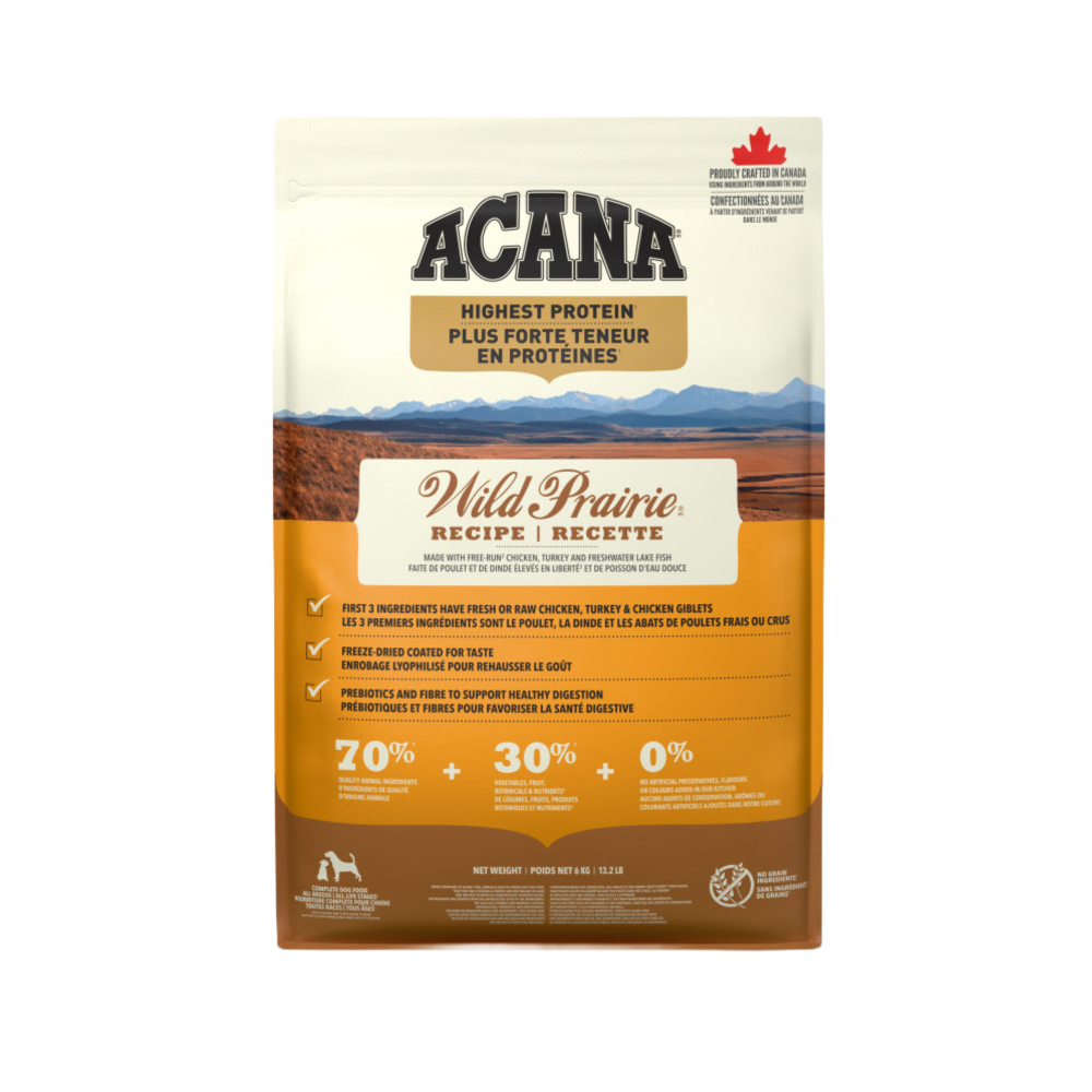 When it comes to ACANA™ recipes, we’re obsessed with choosing ingredients that are nutritious, delicious and protein-rich. Our Highest Protein Dog Food is perfect for satisfying your dog with even more of the animal protein they crave. Our Wild Prairie recipe is crafted with 70% quality animal ingredients like free-run chicken and turkey, wild-caught and sustainably farmed fish balanced with 30% fruit and vegetables to help nurture your dog with flavour and animal protein. It also includes prebiotics and fibre to help support your dog’s digestive health. And with no artificial colours, flavours or preservatives added in our kitchen, it’s a recipe you and your dog will both love. Nurture your dog with protein-rich, nutritious, and delicious dog food to help them live a healthy, happy life.