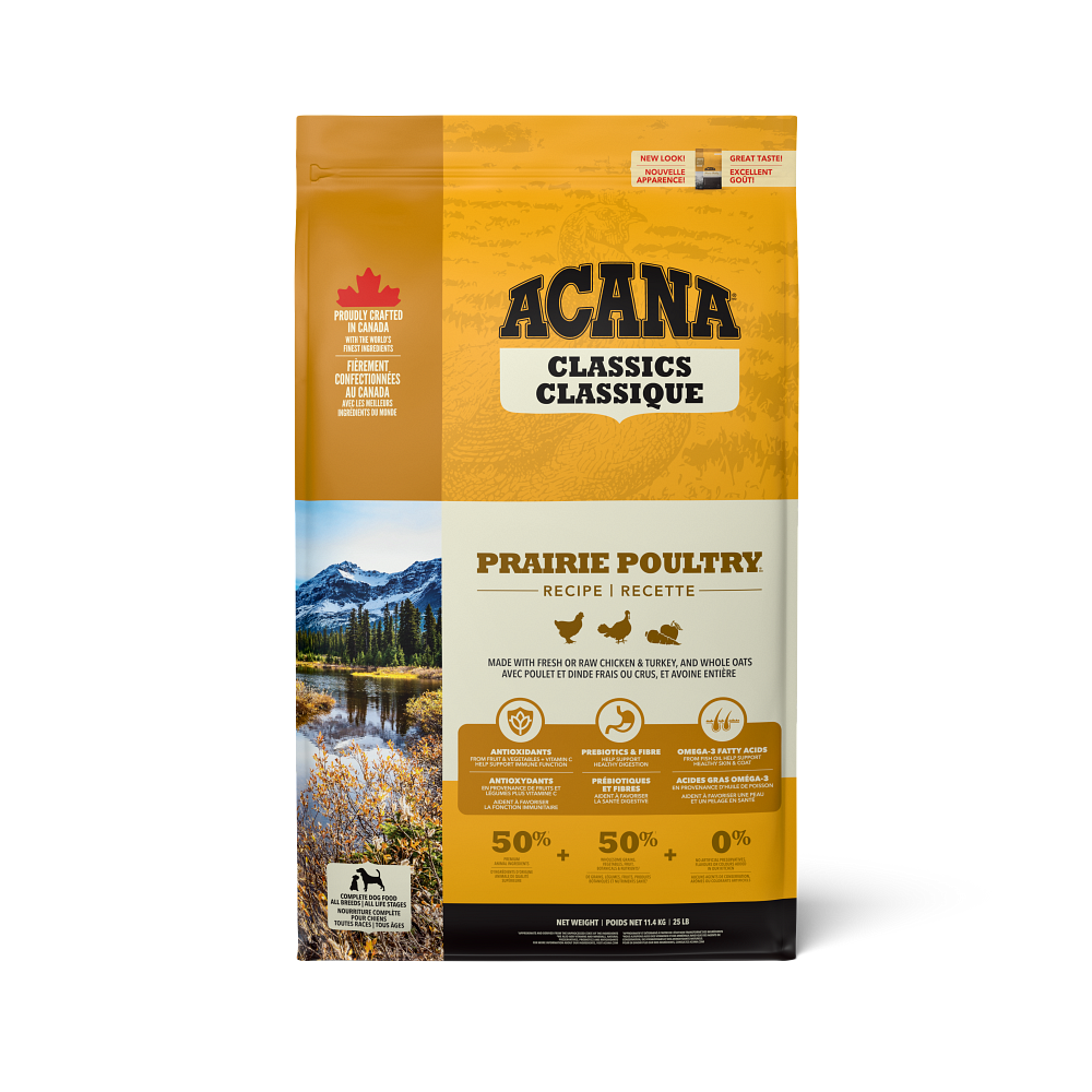 ACANA™ recipes are thoughtfully crafted from start to finish with delicious, quality ingredients. With a balanced 50/50 split between rich poultry ingredients and nutritious fruit, grains and vegetables, ACANA Classics Prairie Poultry recipe provides your dog with a filling and nutritious meal crafted from simple, wholesome ingredients. It also includes nutrient-rich ingredients that support three key health benefits, including immune function, healthy digestion, and healthy skin and coat. Feed your dog premium nutrition at a classic price with ACANA Classics Prairie Poultry recipe
