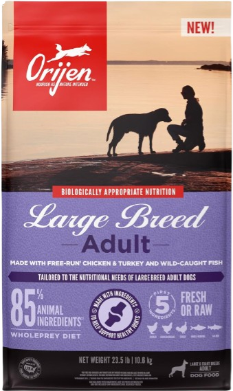 Help your large breed dog thrive with a Biologically Appropriate diet packed with whole animal ingredients. Our ORIJEN™ Large Breed Adult diet is tailored to the unique needs of large breed dogs, and it helps support key health benefits including Joint Health, Skin & Coat Health and Digestive Health. Crafted with 85%* quality animal ingredients like free-run** chicken and turkey, and wild-caught fish, this recipe is rich with nutrients that help your large breed dog be their best. Packed with WholePrey animal ingredients like organs, this recipe is made with the most nutrient-dense, succulent parts of the prey to deliver the nourishment large breed dogs need. The result is a diet for your canine companion that is beyond comparison.